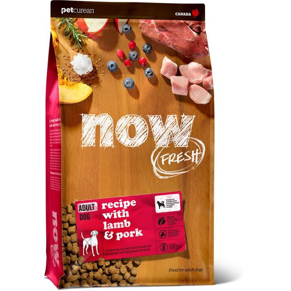 Now Fresh מתכון לבוגרים בלבד מבשר אדום, נטול דגנים עשוי 100% טלה ובשר חזיר טרי, מכיל שמני אומגה 3 ו -6 טריים מקוקוסים וקנולה.