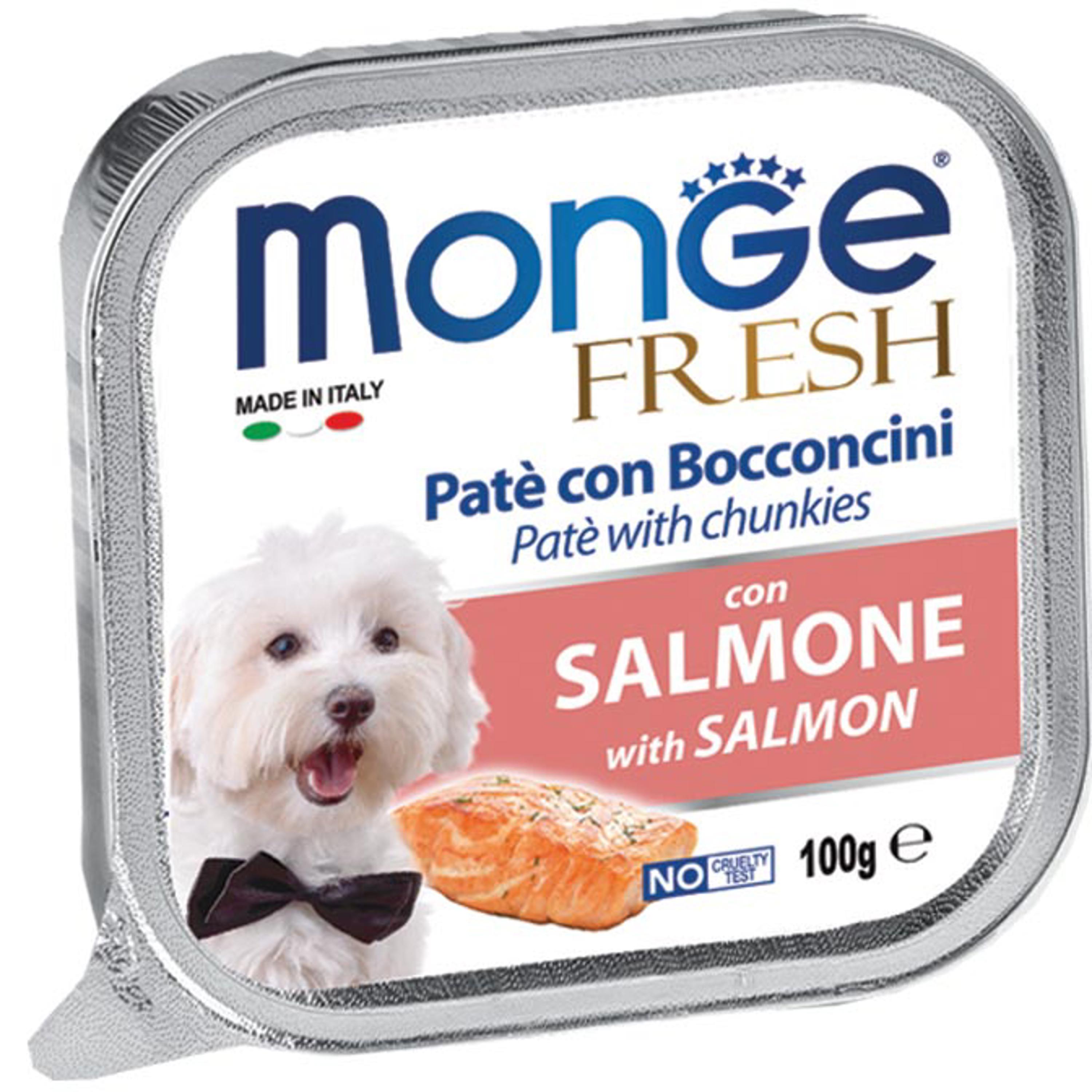 מגשית מזון רטוב לכלבים שהיא פינוק אמיתי, שילוב של פטה וחתיכות, עם נתחי סלמון 100 גרם