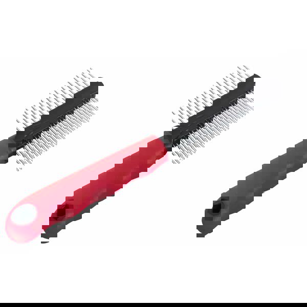 מסרק מתכת דו צדדי עם ידית פלסטיק קשיחה ונוחה לאחיזה.