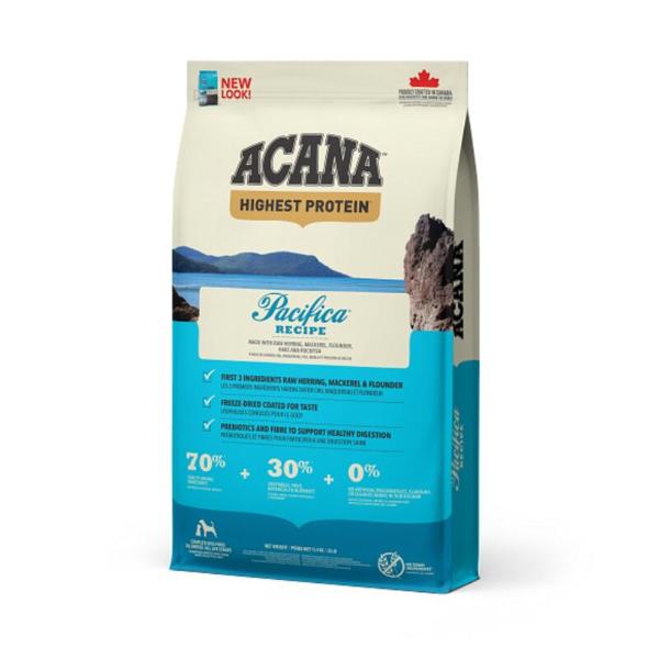 Acana Pacifica for Dogs הוא מזון פרימיום לכלבים המבוסס על תזונה עשירה ומגוונת מהים. המזון מכיל 70% דגים טריים וצוננים מהחוף הפסיפי של קנדה, כולל הרינג, סרדינים, דגי פלאונדר, הייק ודגי סלע, המספקים חלבון איכותי ותזונה טבעית לכלבך. הפורמולה נטולת דגנים ומתאימה לכלבים מכל הגזעים והגילים, עם תוספת של ירקות, פירות ועשבי תיבול המחזקים את מערכת החיסון ותורמים לבריאות העור והפרווה. Acana Pacifica מיוצר בשיטות בישול עדינות השומרות על הערכים התזונתיים של המרכיבים, ללא תוספים מלאכותיים, ומבטיח תזונה מאוזנת וטבעית לכלבך.